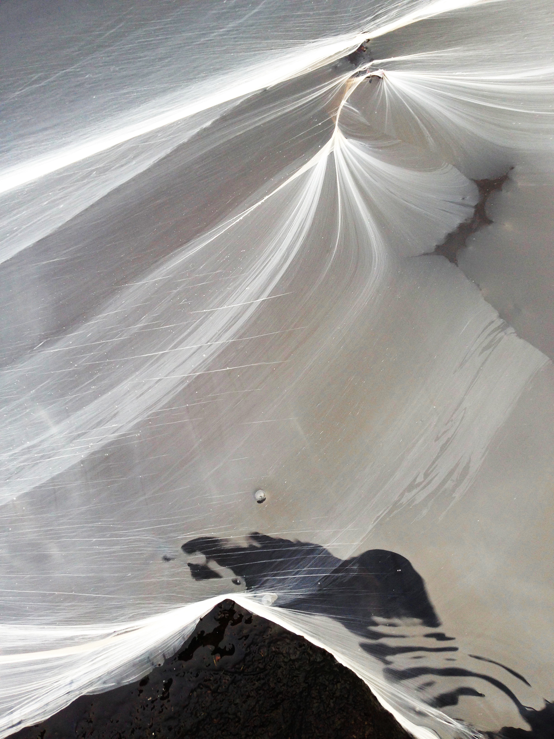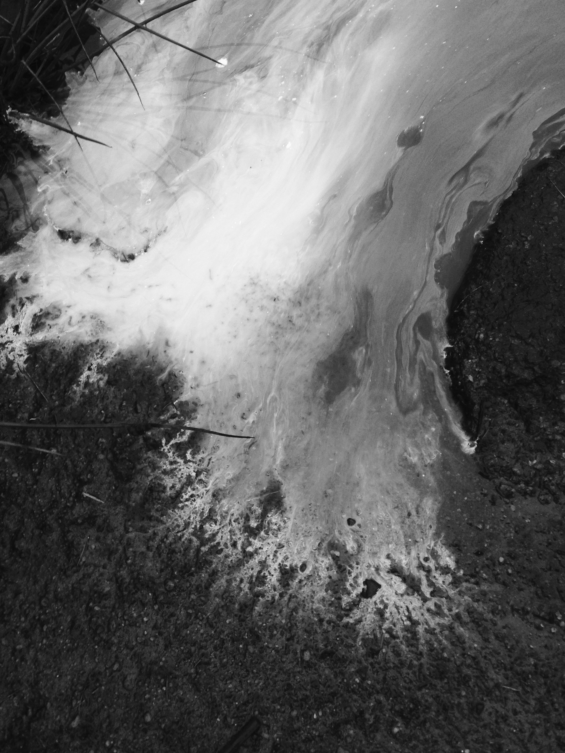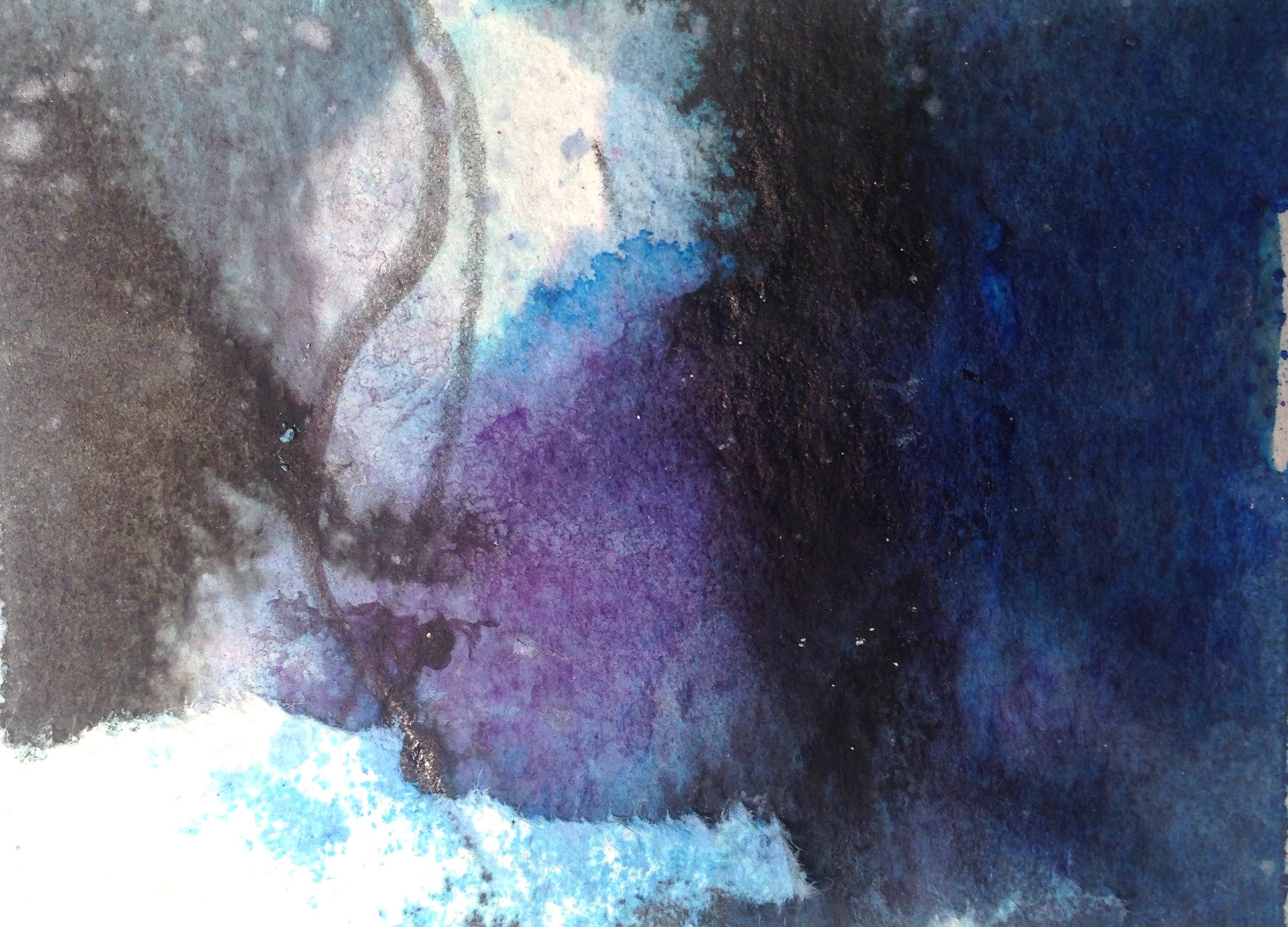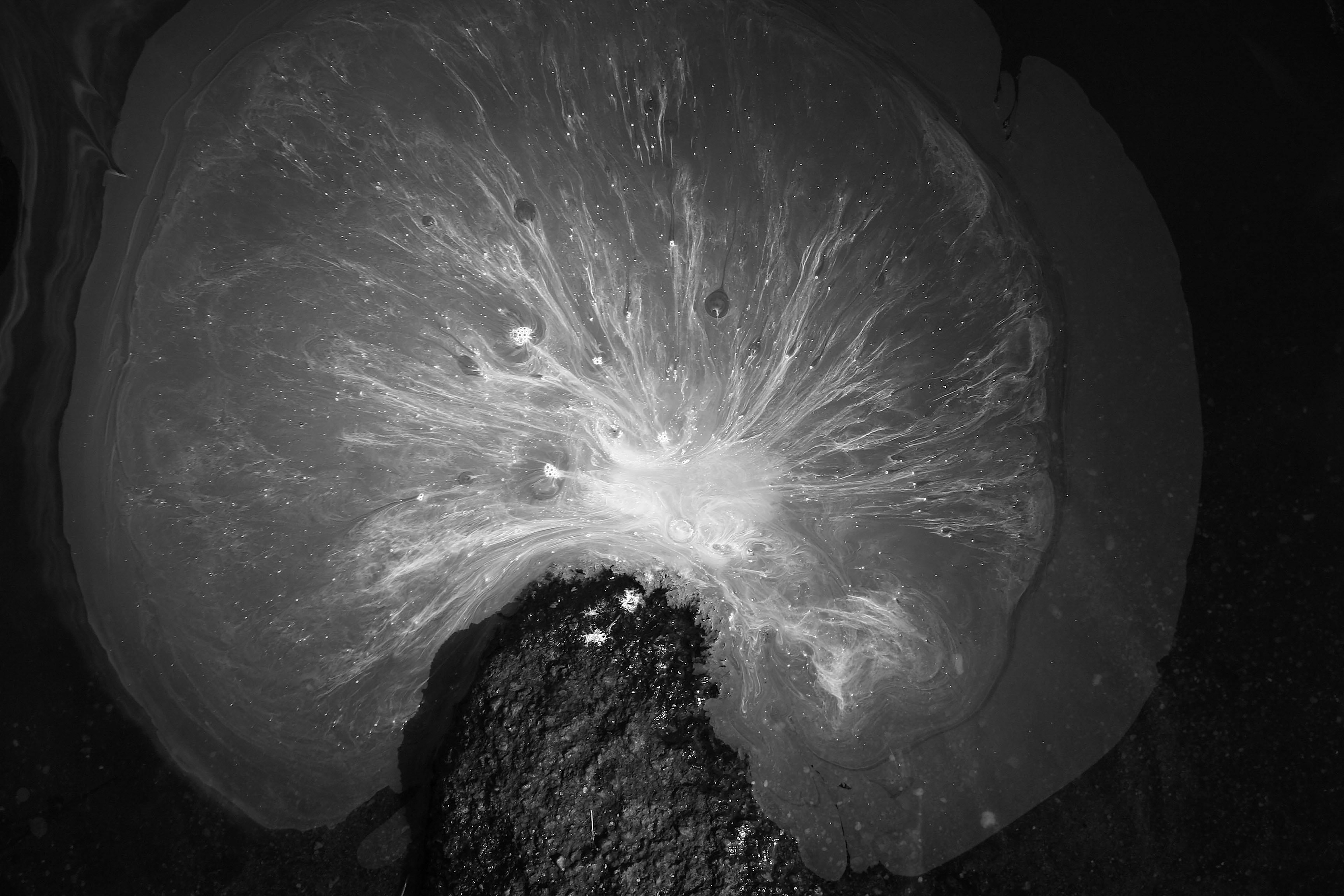 Slow exposure photographs of white pigment dropped into a dark, peaty pool. Doxey Pool sits on top of the Roaches in the Peak District. Ink paintings sit alongside the photography.